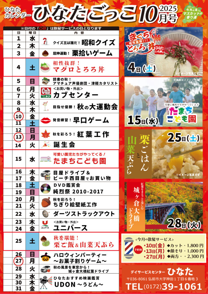 最後にデイサービスセンターひなたの10月の行事表をご紹介致します。