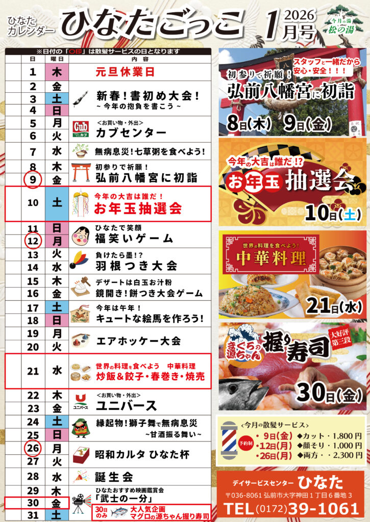 最後にデイサービスセンターひなたの1月の行事表をご紹介致します。