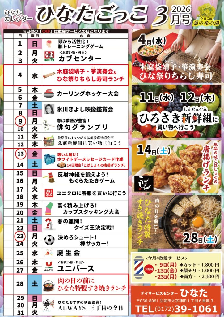 最後にデイサービスセンターひなたの3月の行事表をご紹介致します。