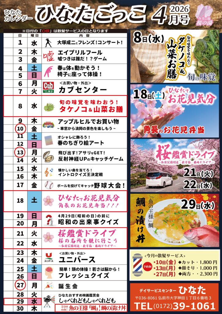 最後にデイサービスセンターひなたの4月の行事表をご紹介致します。